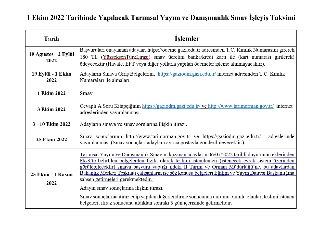 24 Eylül 2022 tarihinde yapılacağı bildirilen Tarımsal Yayım ve Danışmanlık Sınavının, ÖSYM'nin sınav takvimini güncellemesi sonrası KPSS alan sınavlarıyla aynı tarihe tekabül etmesi nedeniyle 1 Ekim 2022 tarihinde yapılması kararlaştırılmıştır.